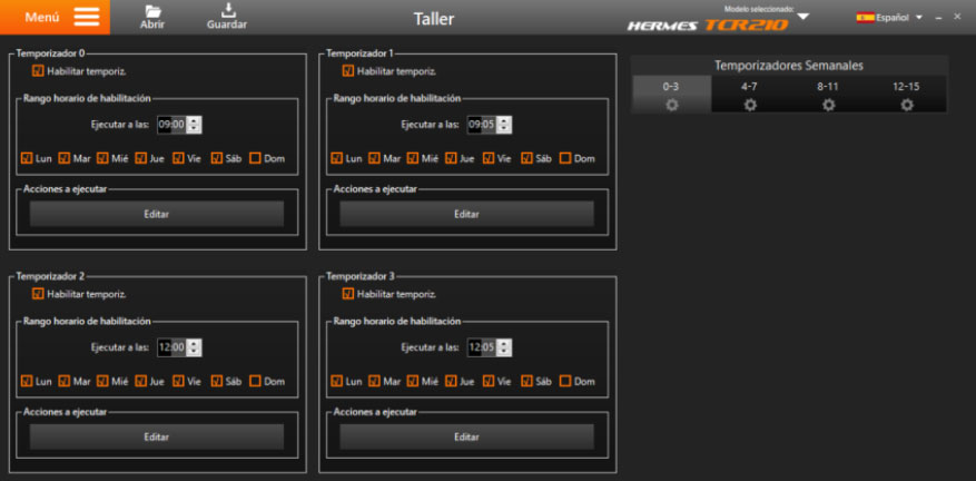 Programación de salidas: Las salidas digitales se pueden programar para que se activen y desactiven automáticamente, a través de temporizadores cíclicos, semanales y mensuales, con diversas opciones de configuración.