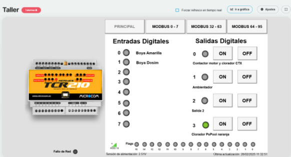 - Salidas: controlar salidas digitales: encender o parar motores, focos, contactores, bombas de achique, riego, cloradores salinos,… entre otros.