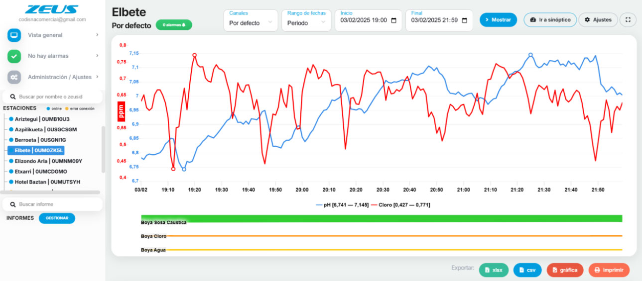 Podemos establecer alarmas configurables para cada parámetro de la centralita (cloro, pH, temperatura...), el sistema nos avisa a través de diferentes medios si el parámetro sale del rango que nosotros establecemos. También se puede editar para que envíe otra notificación cuando el parámetro vuelve a su rango. También podemos configurar alarmas para cada entrada digital.